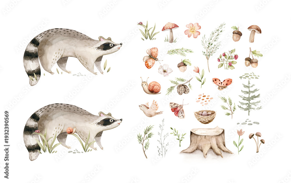 Watercolor cute baby raccoon animal. Woodland nursery isolated whimsical illustration soft pastel for children. watercolour stump and acorn forest drawing with floral elements. #1932390569