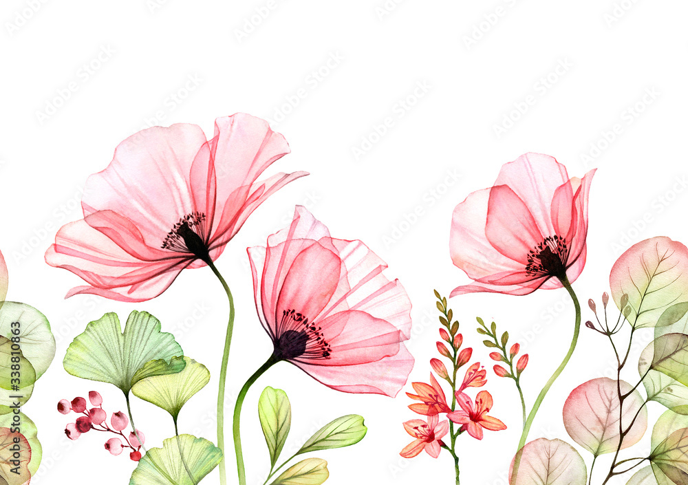 Watercolor Poppy seamless border. Horizontal repetitive pattern. Abstract pink flowers with leaves and fresia branches on white. Botanical illustration for cards, wedding design #338810863