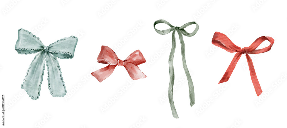Watercolor set of a lace and satin bows. Cozy winter design. Hand painted element for invitation, social media and posters. #1812366727