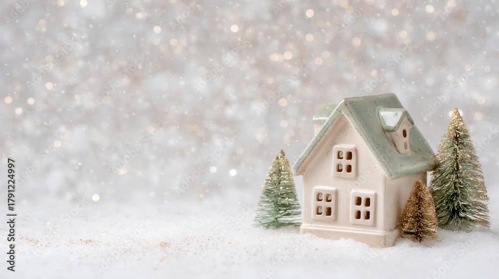 White house with a green roof sits in the snow #1791224997