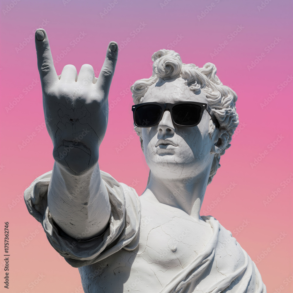 White marble statue with sunglasses making a rock hand gesture against a colorful background #1757362746