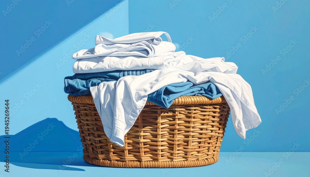 Wicker laundry basket with neatly folded clothes against blue background symbolizing cleanliness organization and home care #1945269644