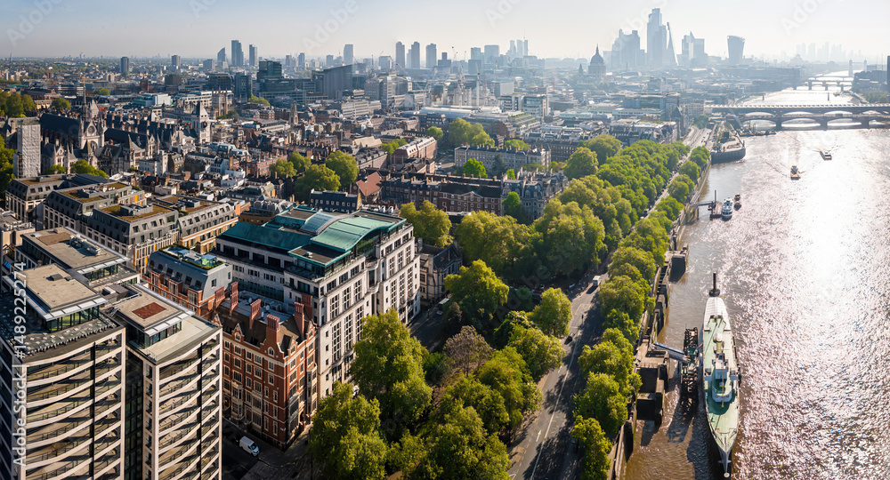 Wide aerial view of central London skyline and the River Thames on a sunny day #1489225274