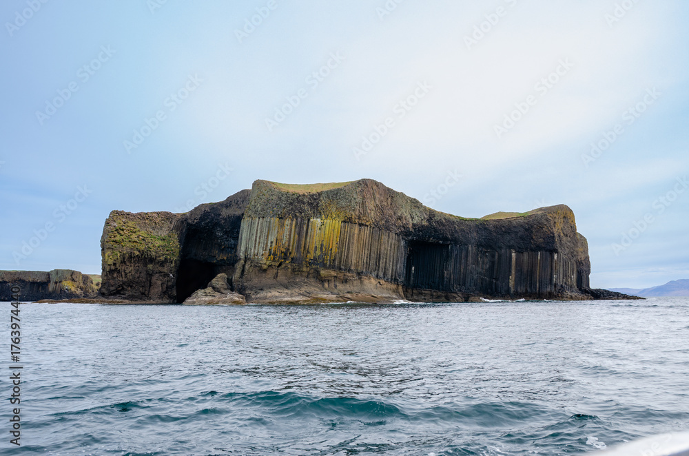 Wide view of Fingal’s Cave and the hexagonal basalt columns of Staffa Island, Scotland, with the ocean in the foreground and a pale blue sky. #1763974440