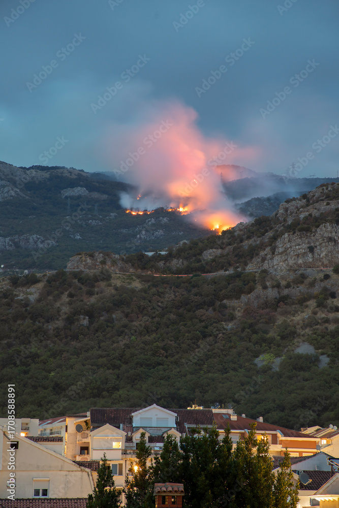 Wildfire above Budva, Montenegro, August 29, 2025. Flames and smoke rise from the hills before rain extinguished the fire overnight. #1708588891