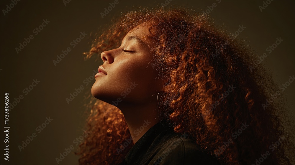 Woman in peaceful reverie with curly hair, eyes closed, bathed in warm light. Serene portrait of a moment of introspection and quiet beauty. #1737806266