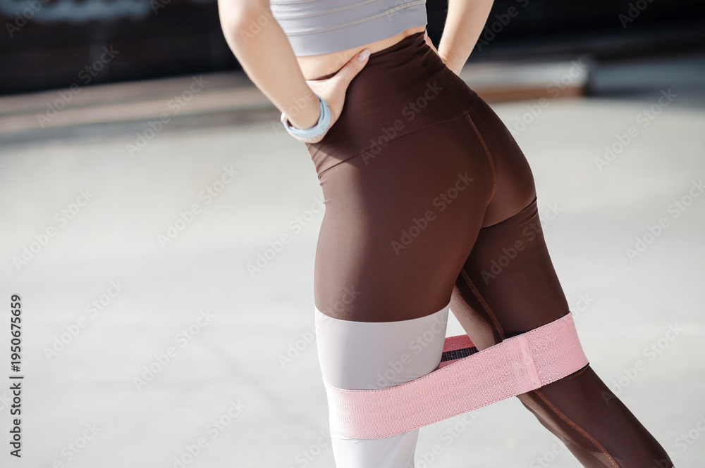 Woman performing glute exercises with a resistance band around her thighs outdoors #1950675659