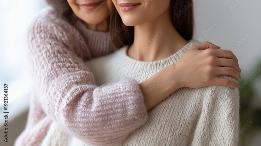 Women embracing each other while smiling indoors in cozy sweaters #1921364137