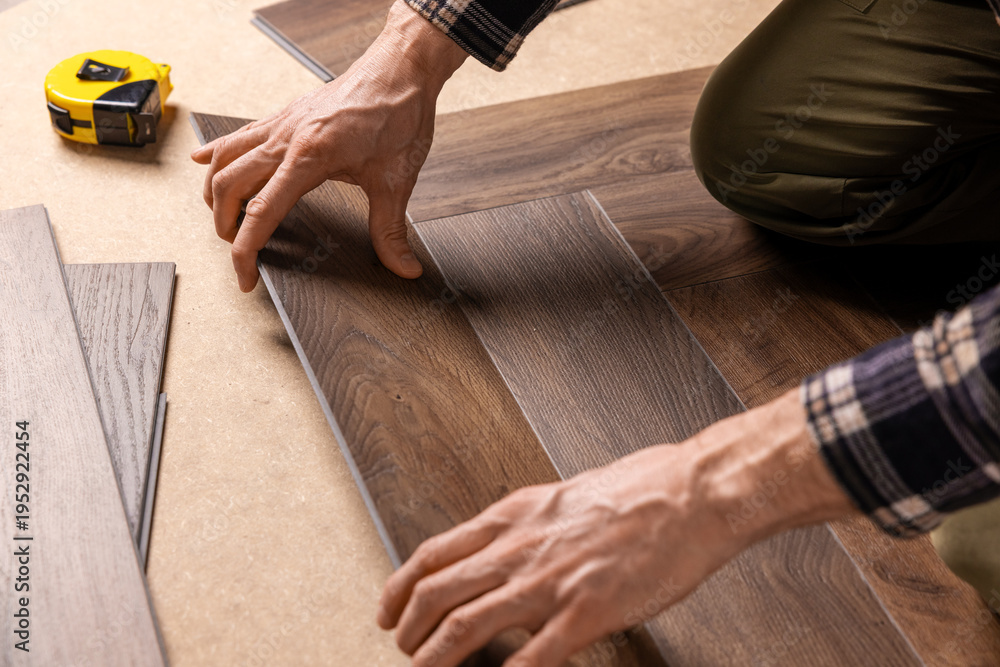 worker installing new vinyl tile wood texture flooring in a herringbone pattern. home improvement #1952922454