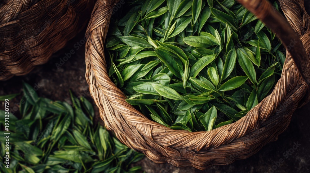 Woven basket filled with fresh picked green tea leaves #1971330739