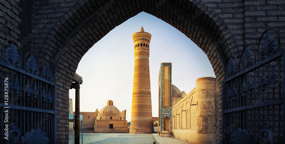 Yard of Poi Kalyan oriental complex at sunset. View from the gate. Bukhara, Uzbekistan #128875876