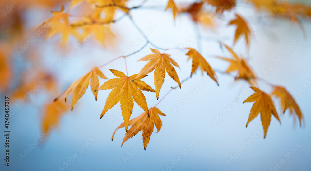 Yellow autumn leaves on the branches against the background of the turquoise sky. Very shallow focus. Colorful foliage in the autumn forest. Excellent background on autumn theme. #1748457317