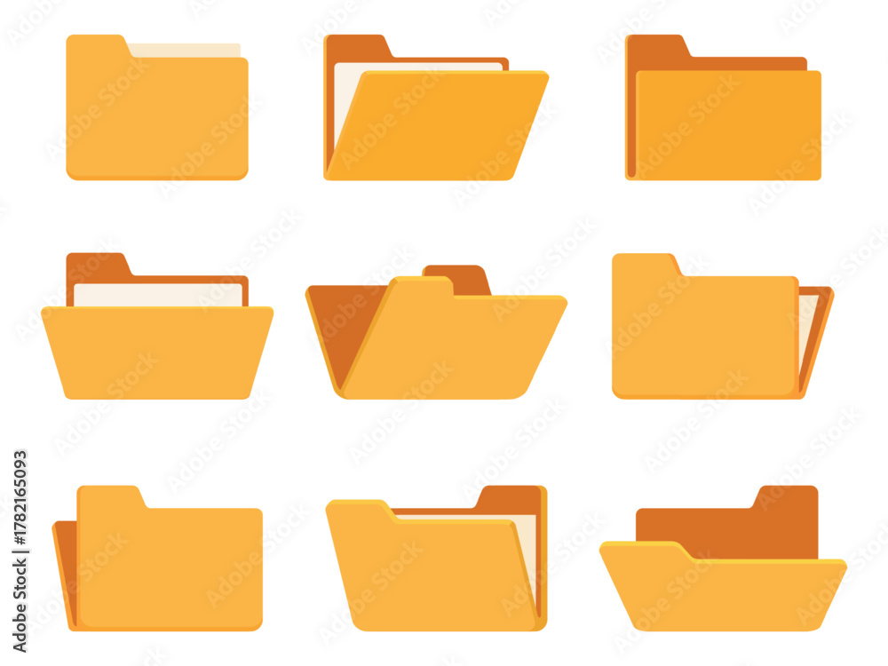 Yellow folders. Isolated paper folder various rotations. Empty papers storage, documents organization symbol. Office equipment, sapid vector element #1782165093
