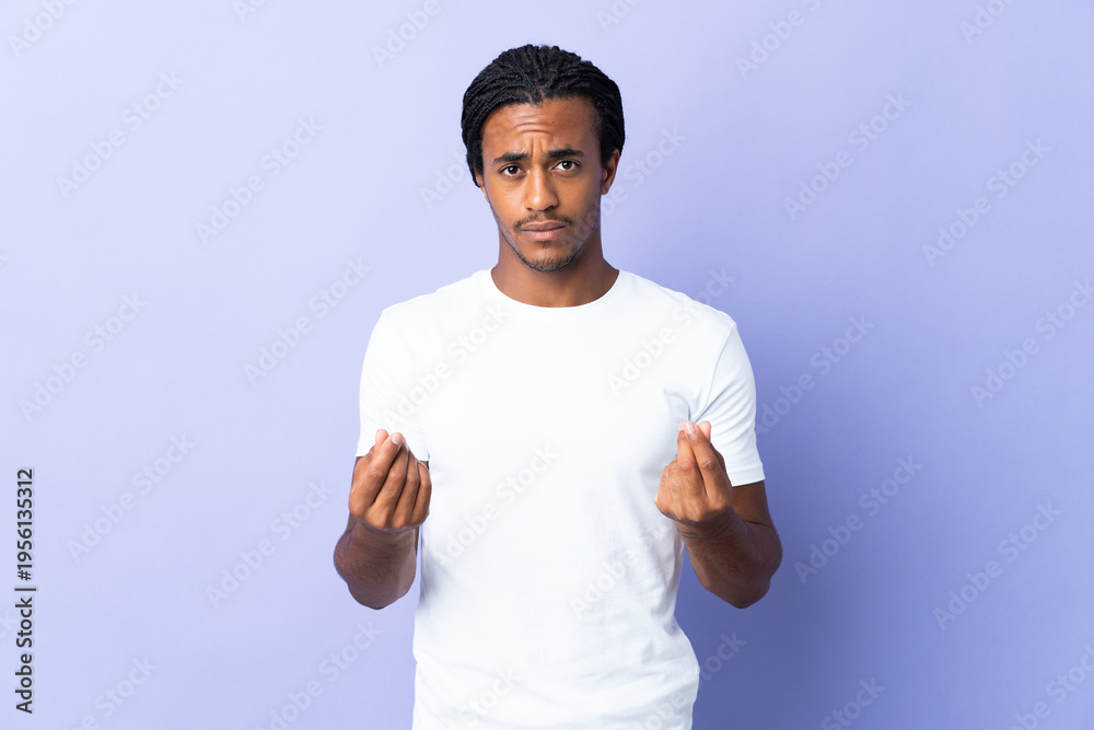 Young African American man with braids man isolated on purple background making money gesture but is ruined #1956135312