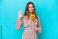 Young caucasian woman holding sunflower isolated on blue background showing ok sign with fingers #1964167182