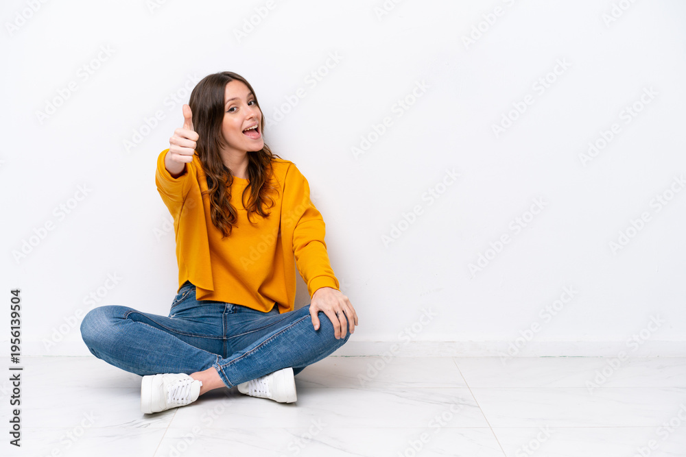 Young caucasian woman sitting on the floor isolated on white wall with thumbs up because something good has happened #1956139504