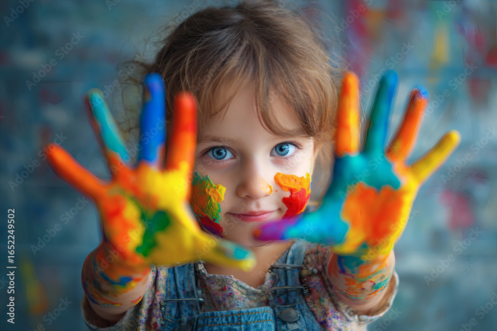 Young Girl with Paint-Covered Hands Expressing Creativity and Joyful Childhood Against a Modern Background #1652249502