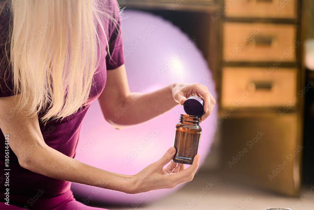 Young woman in sportswear holding bottle with vitamins leading active and healthy lifestyle. Woman in sportswear opens supplement bottle at home after fitness routine with exercise ball behind #1806144132