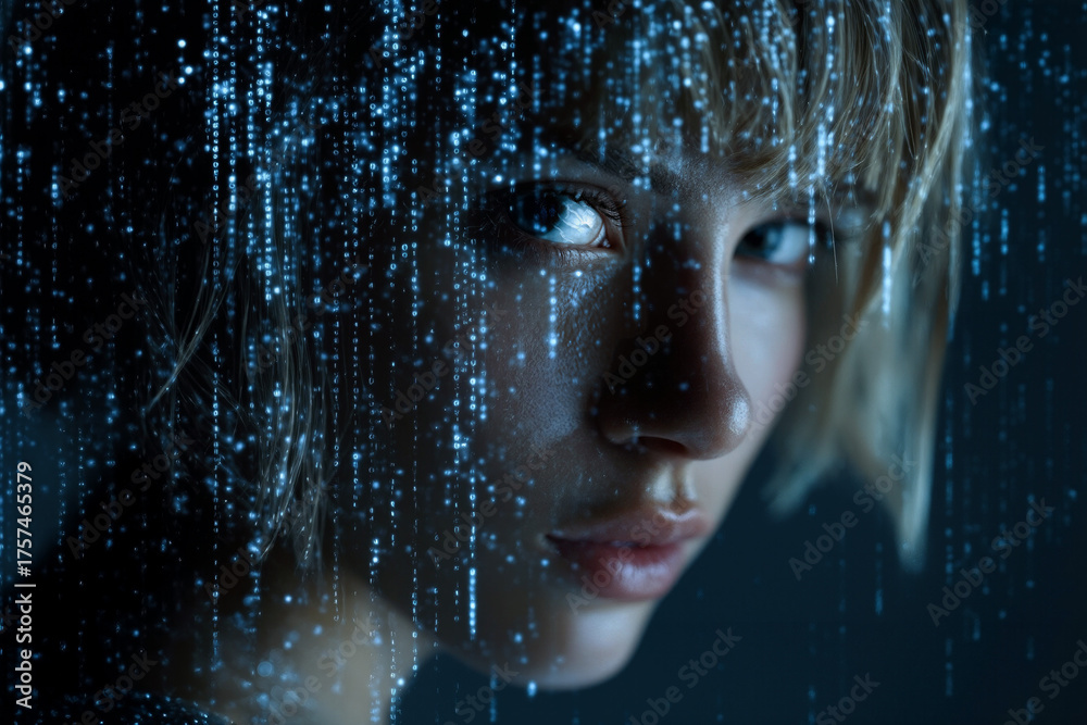 Young woman surrounded by flowing digital data in a dark, futuristic setting, creating a captivating visual experience #1757465379