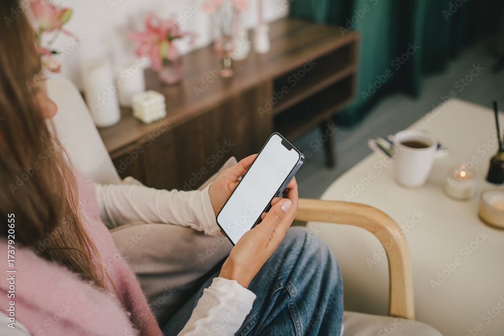 Young woman using her smartphone, relaxing in a cozy living room. #1737920655