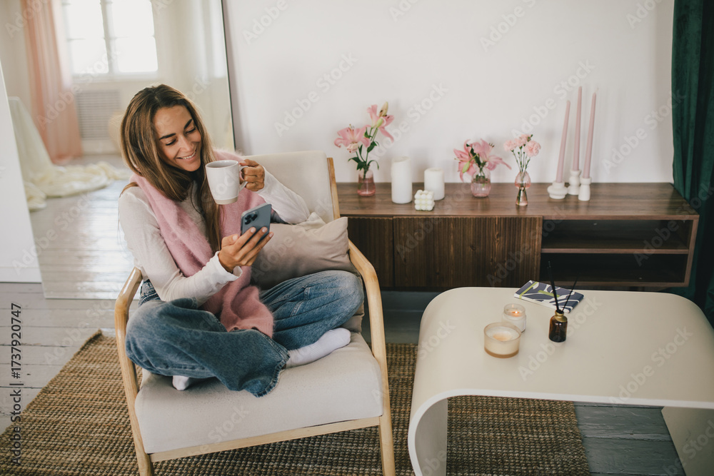 Young woman using her smartphone, relaxing in a cozy living room. #1737920747