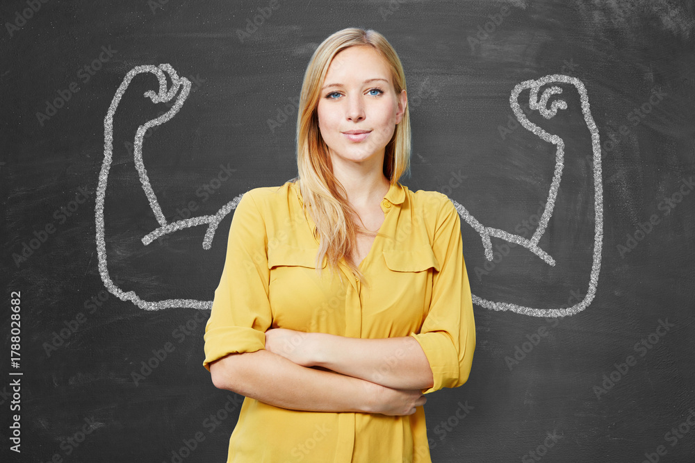 Zufriedene Studentin steht vor Tafel mit Muskel Armen als Konzept #1788028682