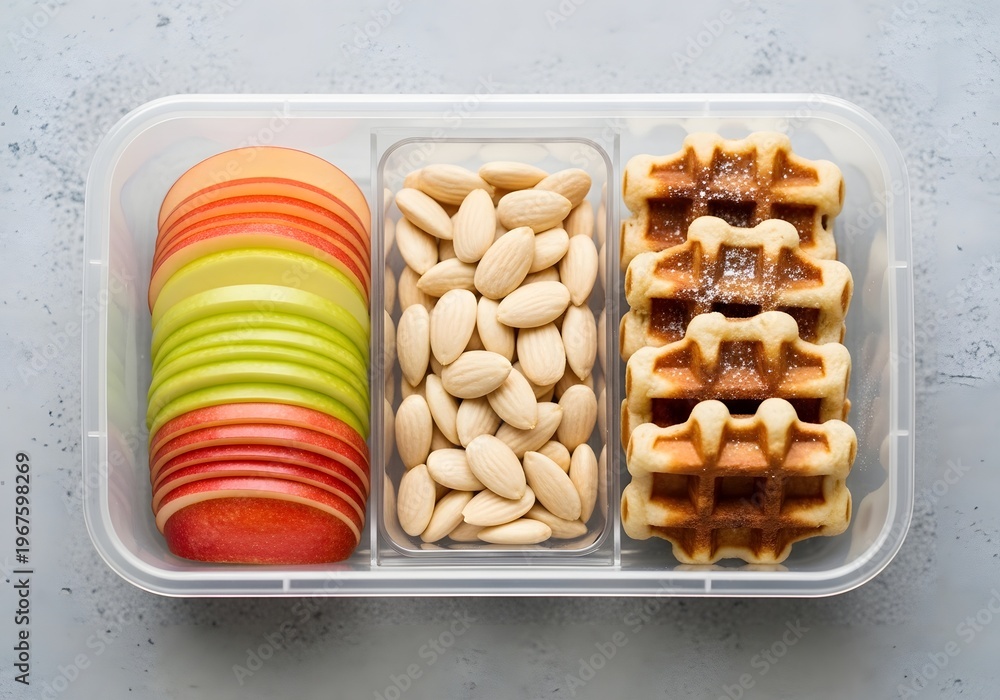 A balanced meal of sliced apples, almonds, and golden waffles is attractively presented in a divided container, making a nutritious and appealing option for a quick meal or convenient snack #1967598269