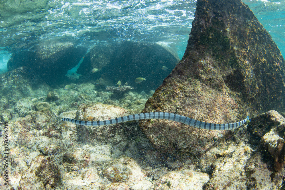 A Banded sea krait, Laticauda colubrina, swims over the rocky reef at Pulau Serua in the Banda Sea, Indonesia. This remote island harbors aggregations of these venomous yet docile sea snakes. #1770925714