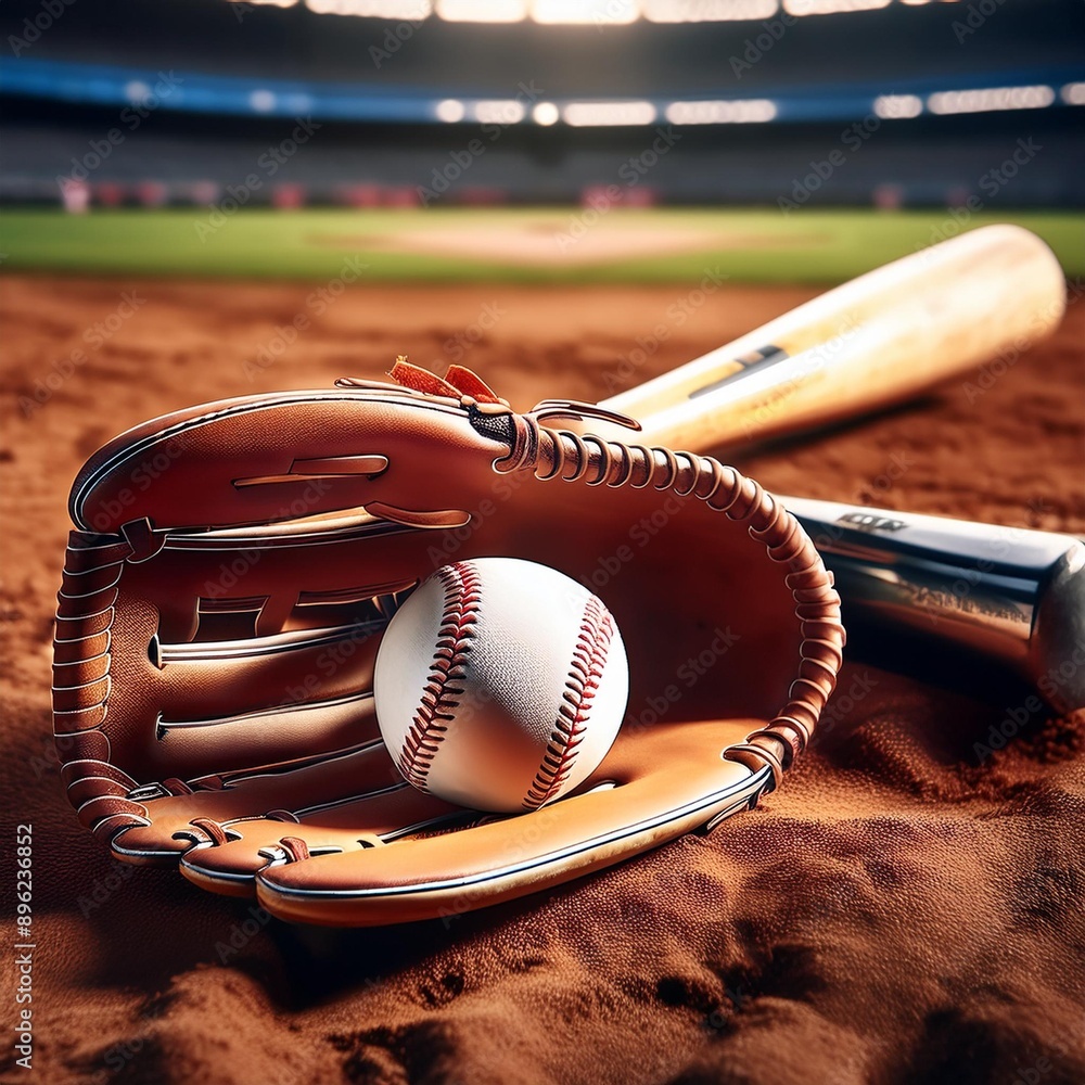 A baseball inside a baseball glove lies on the baseline of the baseball park, with clay dirt, green infield grass, and the sun shining in the infield. #896236852
