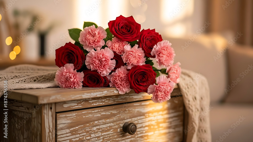 A beautiful bouquet of red roses and pink carnations on a distressed wooden side table in a cozy living room #1874376558