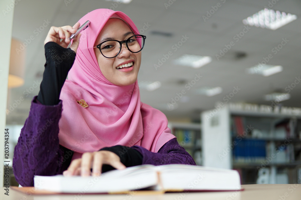 A beautiful Muslimah student holding a pen and smiling in the library #203794354