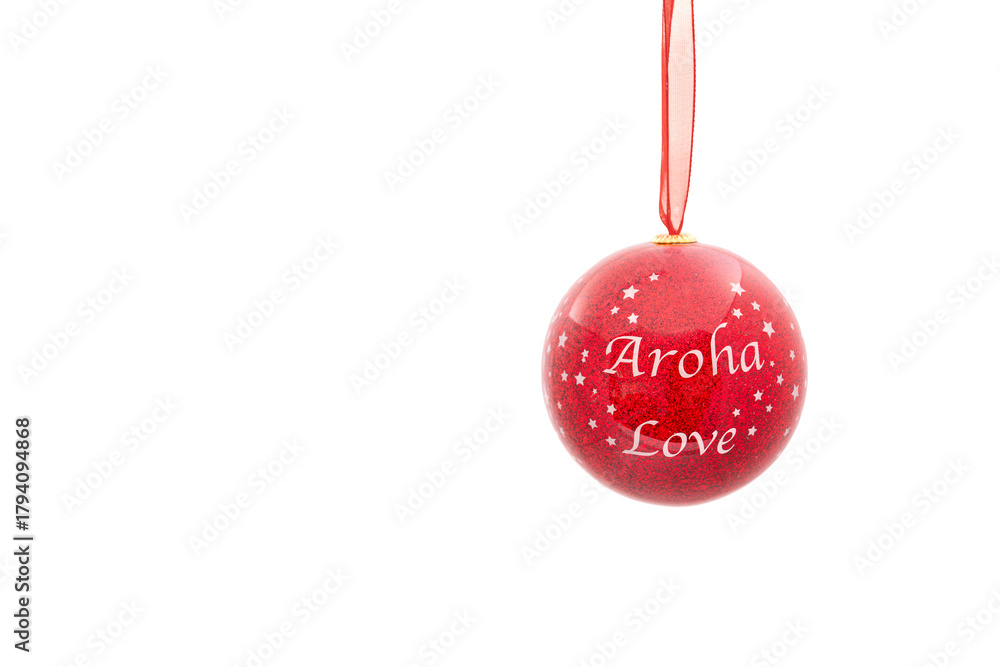 A beautiful shiny red Christmas bauble seen against a plain white background. The words Aroha and Love are written as a sentiment on the front face of the decoration. #1794094868