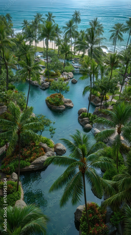 A beautiful tropical sanctuary view from a hotel room balcony, a serene and calm scene. #1761953364