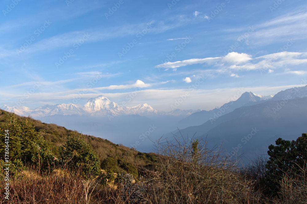 A beautiful view during a trek. The Himalayas mountains, including snow capped peaks, are prominent in the background under a blue sky in Nepal #1780641254