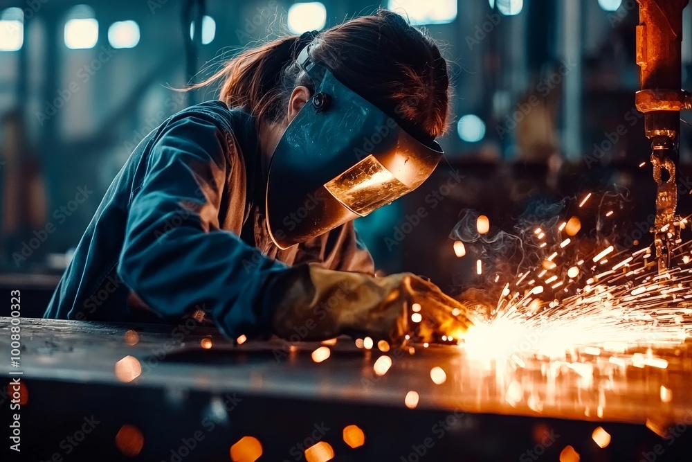 A beautiful woman with mask welding large steel pipes, sparks flying as she works with focus #1008800323