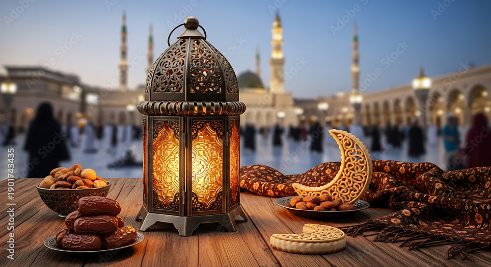 A beautifully decorated lantern and traditional Ramadan foods on a wooden table in front of a mosque at dusk #1901743435