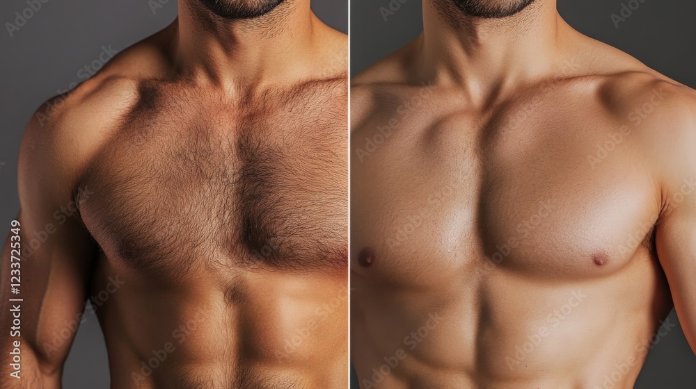 A before-and-after photo of a man’s chest, where the left side displays body hair and the right side shows the smooth results of waxing, highlighting the contrast and the effectiveness of modern hair #1233725349