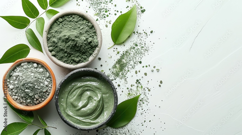 A big copy space with Exfoliating scrub with green clay and natural ingredients Beauty mask applied on white background. top view. Generative AI. #738717296