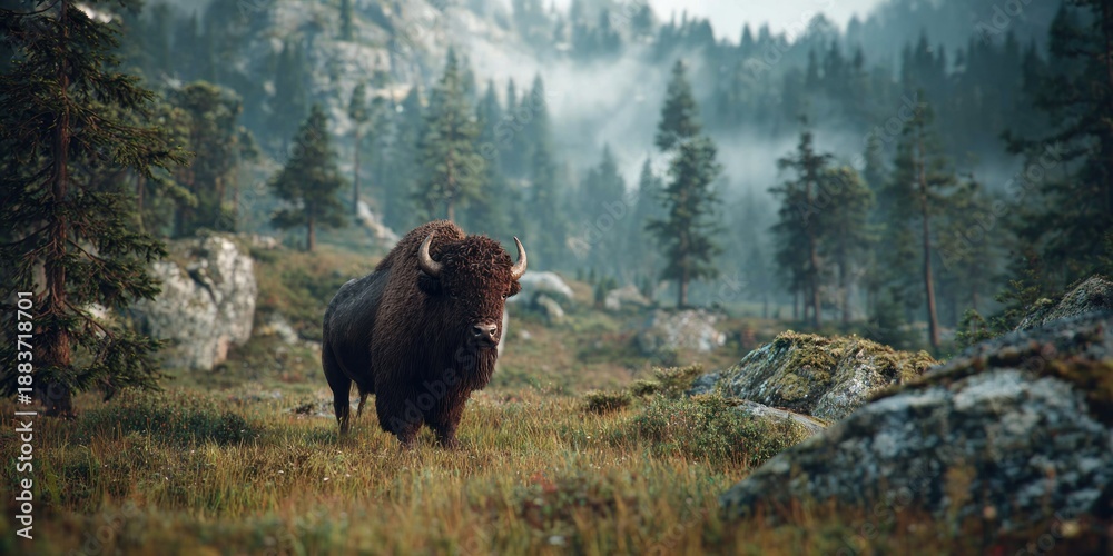 A bison stands in a grassy clearing in a forest with fog, overlooking a mountain range #1883718701
