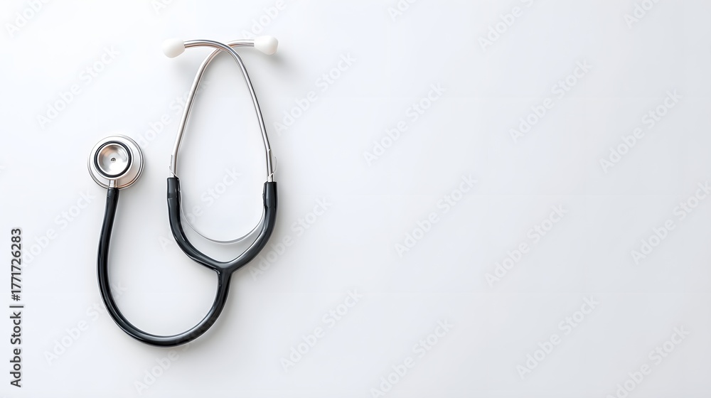 A black and silver medical stethoscope is presented on a minimalist white surface highlighting its role in healthcare diagnosis and patient examinations #1771726283