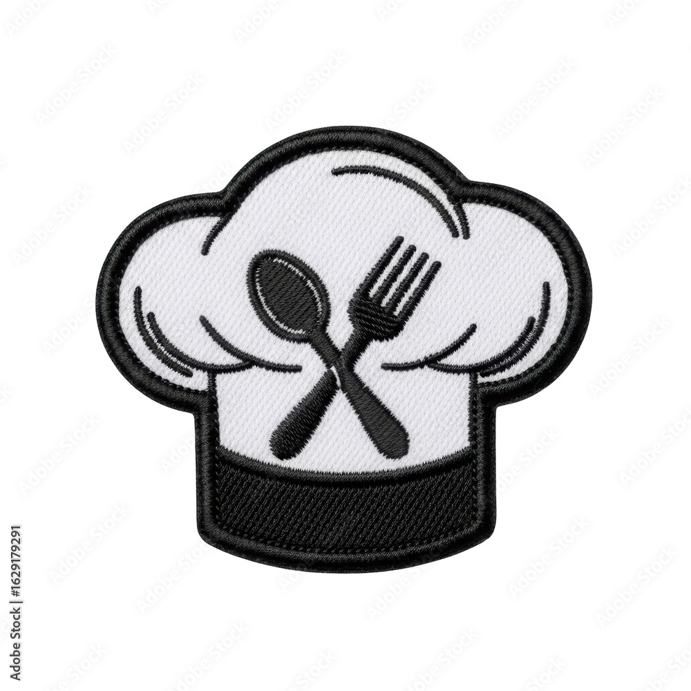 A black and white embroidered chef hat features a crossed spoon and fork, ideal for culinary branding or restaurant decor. #1629179291
