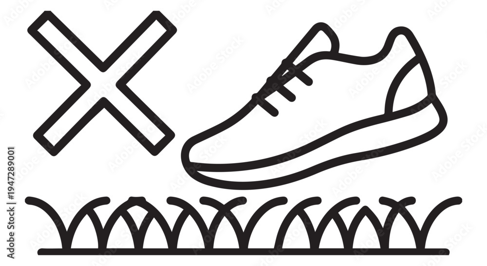 A black and white illustration of a shoe with a large X and grass. #1947289001