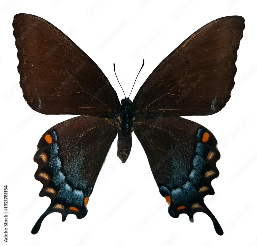 A black butterfly swallowtail Papilio glaucus is shown with wings open. This butterfly is isolated in a setting that emphasizes its form and colors. #1921781134