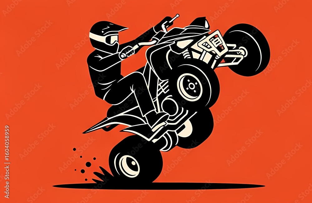 a black crazy quad rider doing a wheelie. flat, vector, minimalist, extreme sport, quad, quad bike, atv, illustration, stunt rider, off-road, motorsport, adrenaline, vector artwork, vehicle stunt #1604058959