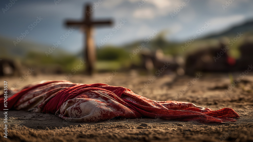 A blood-stained linen lies on the ground in sharp focus, while the blurred silhouette of the cross lingers behind, symbolizing sacrifice through muted red, gray, and brown tones. #1706163537