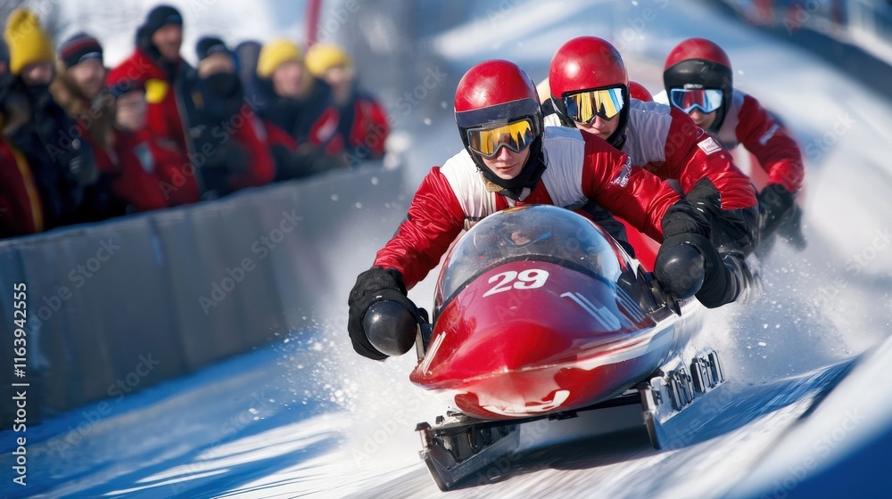 A bobsled team speeding down a sleek icy track at breakneck speed #1163942555