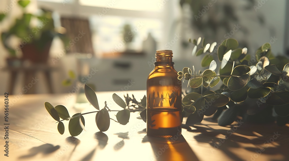 A bottle of eucalyptus essential oil placed on a table with fresh eucalyptus leaves #961660342
