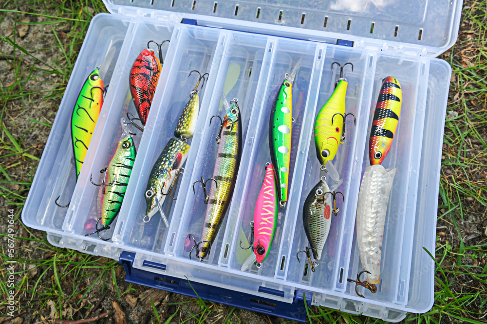 A box of baits for catching fish. Multi-colored lures of different shapes. High quality photo #567491644