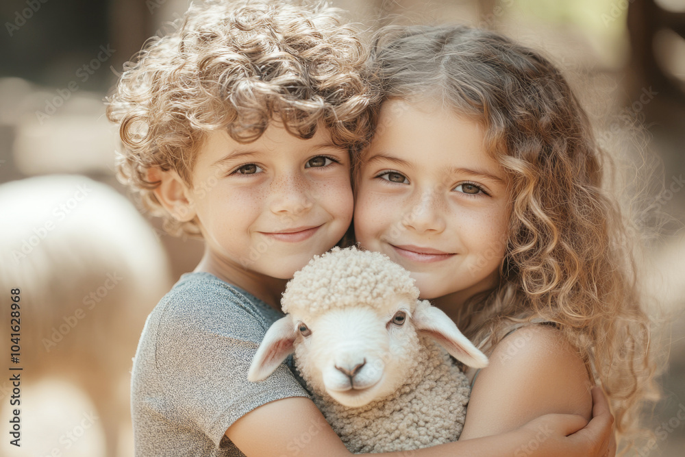 A boy and a girl happily hug a lamb on a sunny farm. The children are smiling happily and looking into the frame. #1041628968