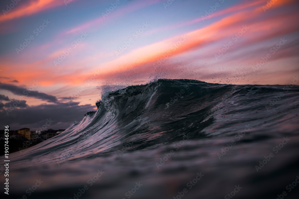 A breaking ocean wave at sunset at Bronte Beach, Sydney, Australia, with soft pink clouds and fading light reflecting across the water. #1907446736